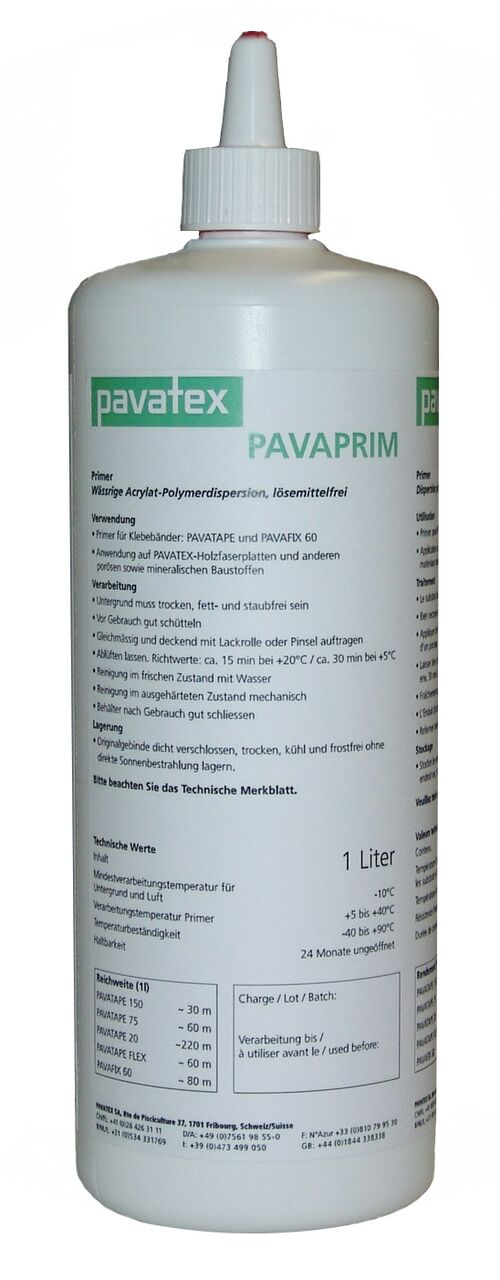 Solvent-free and quick dry primer to use on wood fibre before bonding Pavatape and other tapes to it. Typical Consumption 1L/2 Rolls of Pavatape 150 or 1L/4 Rolls of Pavatape 75. 4.5m² coverage approx. 1L Bottle.
